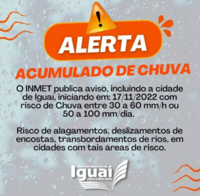 O INMET publica aviso iniciando em: 17/11/2022. Chuva entre 30 a 60 mm/h ou 50 a 100 mm/dia. Risco de alagamentos, deslizamentos de encostas, ... -