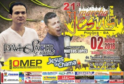 A Ordem dos Ministros Evangélicos de Poções (OMEP), com total apoio da Prefeitura Municipal de Poções, divulgou a atração da Marcha para Jesus 2018. ... -