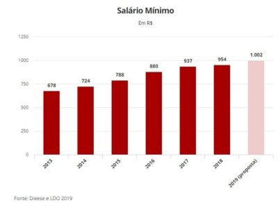 O governo propôs para valer em janeiro de 2019, um salário mínimo de 1.002. O valor consta do projeto de Lei de Diretrizes Orçamentárias ... -