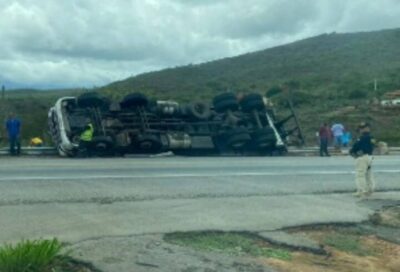 BR-116: Caminhão carregado de peixes tomba entre Poções e o Entroncamento de Boa Nova
